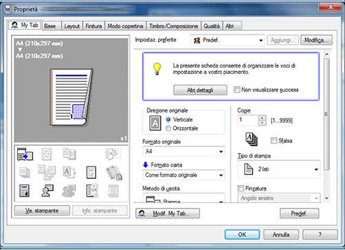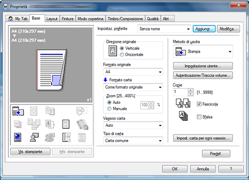 Nella finestra [Preferenze stampa], specificare le condizioni di stampa da registrare come preferite.