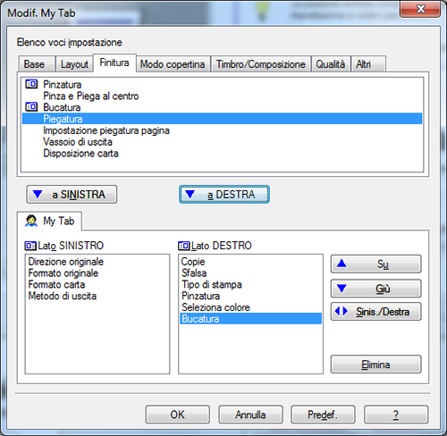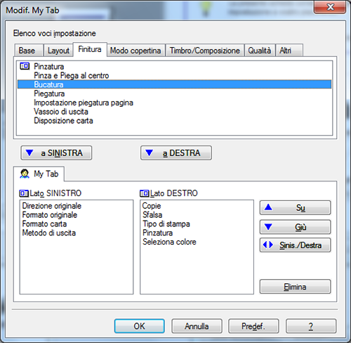 Facendo clic su [a SINISTRA] si colloca la funzione selezionata nell'area sulla sinistra di [My Tab], mentre facendo clic su [a DESTRA] si colloca la funzione a destra di [My Tab].