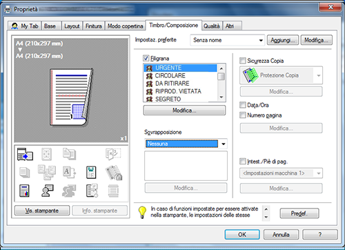 Nella scheda [Timbro/Composizione], selezionare la casella di controllo [Filigrana]. Inoltre, selezionare la filigrana da stampare.