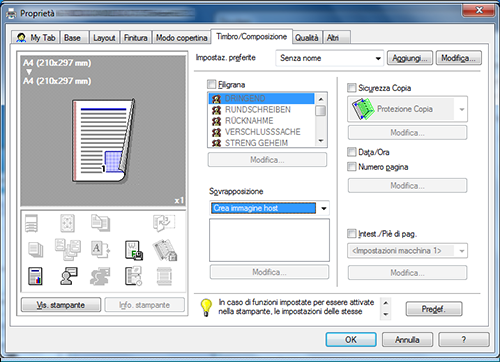 In [Sovrapposizione] nella scheda [Timbro/Composizione], selezionare [Stampa immagine host] o [Stampa immagine periferica] (solo PCL), quindi nell'elenco selezionare l'immagine sovrapposizione da stampare sull'originale come immagine composita.
