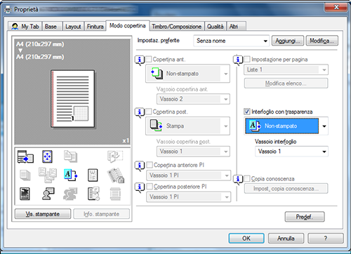 [Copertina post.] | Selezionare questa casella di controllo per inserire e stampare su una copertina posteriore. In [Vassoio copertina post.], selezionare il vassoio carta per la copertina posteriore. Successivamente, specificare se stampare o meno sulla copertina posteriore inserita.