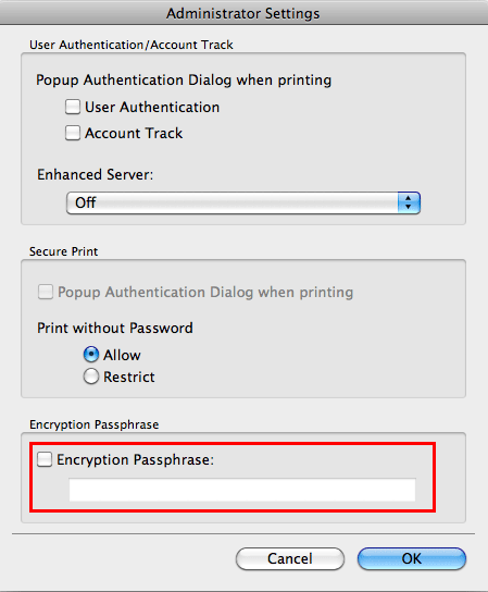 3. Selezionare la casella di controllo [Encryption Passphrase:] e inserire la frase chiave di crittografia (utilizzando fino a 20 caratteri alfanumerici, compresi i simboli) impostata nella macchina.