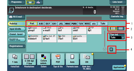 2 | Cambia la visualizzazione delle destinazioni registrate, passando alla modalità pulsante o vista elenco. Se è stata selezionata la modalità vista elenco, è possibile ordinare le destinazioni in base al numero di registrazione, tipo di registrazione o nome registrato. |