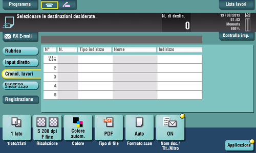 In [Cronol. lavori], selezionare una destinazione dalla cronologia delle destinazioni delle trasmissioni di scansione o dalle destinazioni salvate.