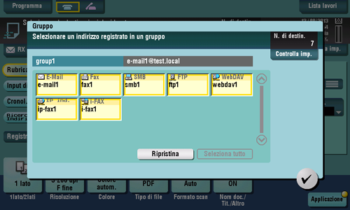 Quando è stato selezionato un Gruppo nella [Rubrica], selezionare, tra le destinazioni registrate nel gruppo, le destinazioni cui si desidera inviare i dati. Se tra le destinazioni registrate nel gruppo è presente una determinata destinazione a cui non si desidera inviare i dati, fare clic su [Seleziona tutto], quindi selezionare la destinazione che si desidera rimuovere dall'invio.