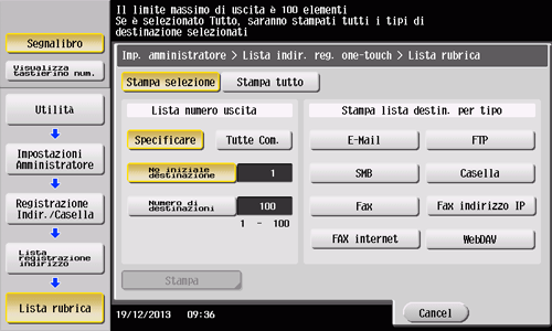 Fare clic su [Utilità] - [Impostazioni amministratore] - [Registrazione Indir./Casella] - [Lista indir. reg. one-touch] - [Lista rubrica].