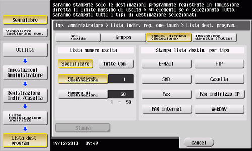 Fare clic su [Utilità] - [Impostazioni amministratore] - [Registrazione Indir./Casella] - [Lista indir. reg. one-touch] - [Lista dest program].
