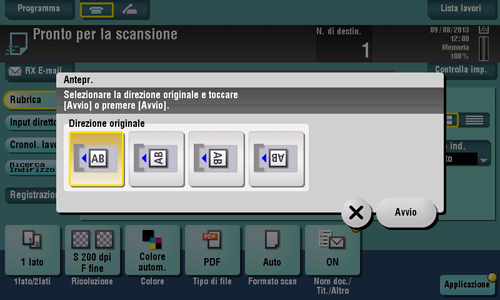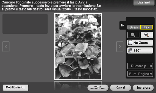 Quando vengono specificate destinazioni diverse da quelle per fax, l'anteprima apparirà con la finestra per la modifica delle impostazioni della funzione di scansione già selezionata. Per controllare l'anteprima fax, premere [Fax] per cambiare visualizzazione.