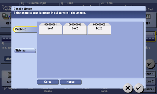 Per salvare l'originale in una casella utente pubblica, casella utente personale o casella utente di gruppo, fare clic su [Pubblico], [Pers.], o [Gruppo] e selezionare la casella utente di destinazione. Fare clic su [Nuovo] e inserire un nuovo numero casella utente per registrare la casella utente di destinazione.