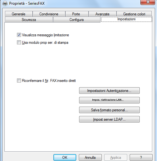 [Visualizza messaggio limitazione] | Selezionare questa casella di controllo per visualizzare un messaggio il quale indica che sono state selezionate delle funzioni del driver fax, che non possono essere utilizzate insieme. |