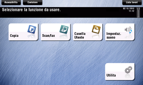 1 | Tasti menu principale | Visualizza i tasti scorciatoia assegnati a ogni funzione. I tasti scorciatoia possono essere personalizzati liberamente in base alle esigenze. Per impostazione predefinita, nel menu principale sono visualizzate le funzioni [Copia], [Scan/fax], [Casella Utente], [Impostaz. suono] e [Utilità]. (La funzione [Utilità] è fissa.)