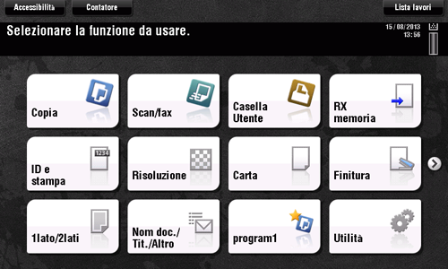Toccare [Programma copia] oppure [Programma fax/scansione] e selezionare Programmi; i programmi registrati sulla macchina possono essere inseriti all'interno del menu principale.
