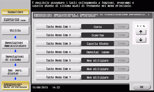 Toccare [Utilità] - [Impostazioni Amministratore] - [Impostazioni di sistema] - [Imp. pers. display] - [Impostazioni di visualizzazione menu principale].