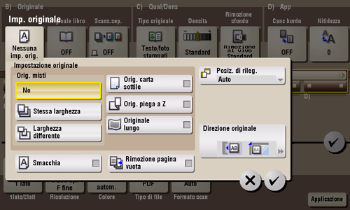 [Impostazione originale] | Configurare le impostazioni in maniera da scansionare gli originali accuratamente, secondo le proprietà degli originali da caricare.