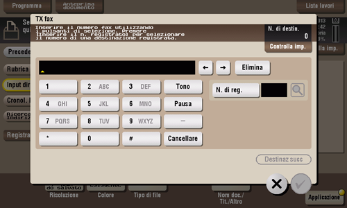 Inserire il numero di fax del destinatario cui inviare un fax. Quando si specificano destinazioni multiple, toccare [Destinaz succ] per aggiungere destinazioni.
