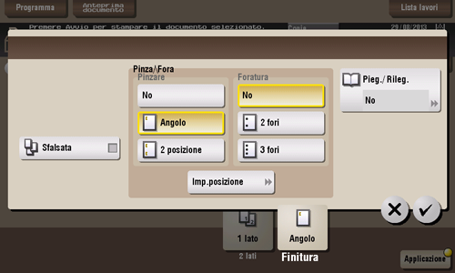[Angolo] | Ogni set di fogli stampati è pinzato in un angolo (in alto a sx o in alto a dx), prima di essere espulso. |