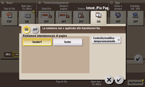 • [Impostazioni intestazione]: Modificare il contenuto dell'intestazione.