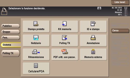 [PDF critt. con passw.] | Quando si stampa un file PDF protetto da password o lo si memorizza nella casella utente utilizzando la funzione Stampa diretta o per mezzo di una memoria USB o dispositivo Bluetooth, il file è memorizzato nella casella PDF crittografato con password. Una volta aperta la casella utente, è possibile selezionare un file PDF memorizzato nella casella per visualizzarlo in anteprima e stamparlo. È anche possibile archiviare il file o eliminarlo dalla casella. Quando si stampa o salva un file PDF, occorre inserire una password impostata per il file. |