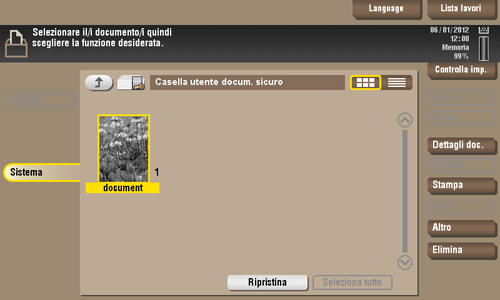Quando si stampa un documento da PC o si seleziona la funzione Stampa protetta utilizzando il driver di stampa, il file di dati sarà memorizzato nella Casella utente docum. sicuro. Una volta aperta la casella utente, è possibile selezionare un file memorizzato nella casella e visualizzarlo in anteprima, stamparlo, rinominarlo o eliminarlo.
