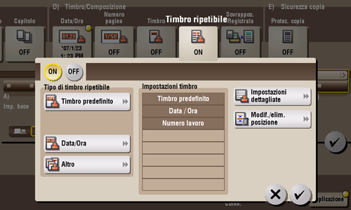 [ON]/[OFF] | Selezionare [ON] per stampare ripetutamente un timbro. |