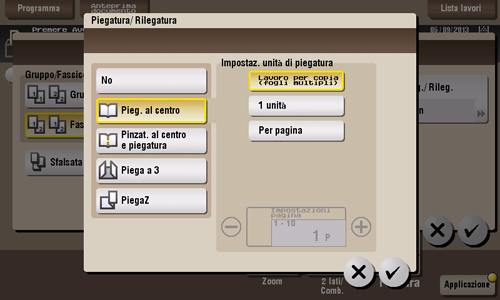 Espelle un foglio stampato piegandolo in due. Selezionare inoltre l'unità di piegatura della carta tra [Lavoro per copia (fogli multipli)], [1 unità] e [Per pagina]. Quando si imposta [Per pagina], specificare il numero di pagine da piegare per volta.