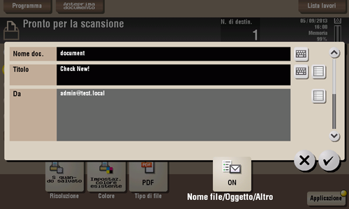 Quando si esegue l'invio per e-mail, è possibile specificare il titolo e il testo del messaggio di un'e-mail e modificare l'indirizzo e-mail del mittente (indirizzo "Da").