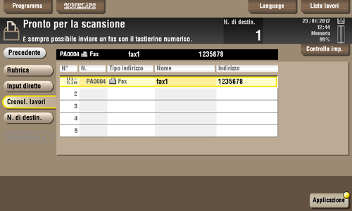 Selezionare una destinazione dalla Cronologia lavoro. I lavori più recenti (fino a cinque) sono visualizzati a scopo di cronologia. Quando necessario, è possibile selezionare destinazioni multiple nella cronologia.