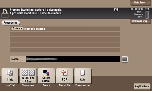 Si può impostare il nome file e le opzioni di memorizzazione quando si salvano su una memoria esterna i dati acquisiti con la scansione di un originale.
