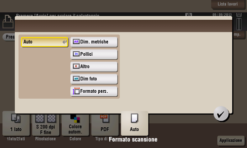 [Dim foto] | Selezionare questa opzione per scansionare foto o documenti in formato foto. Toccare [Dim foto] e selezionare un formato pollici standard. |