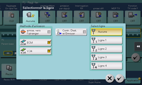 [Sélectionner la ligne] | Si plusieurs lignes sont disponibles, sélectionnez la ligne utilisée pour la télécopie. En général, utilisez [Ligne 1]. Si vous sélectionnez [Aucune], c'est la ligne non occupée qui sera utilisée pour l'émission. |