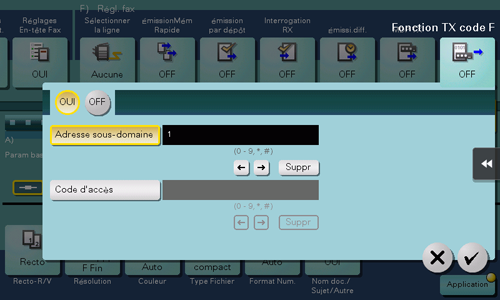 [OUI]/[OFF] | Sélectionnez [OUI] pour spécifier Fonction TX code F. |