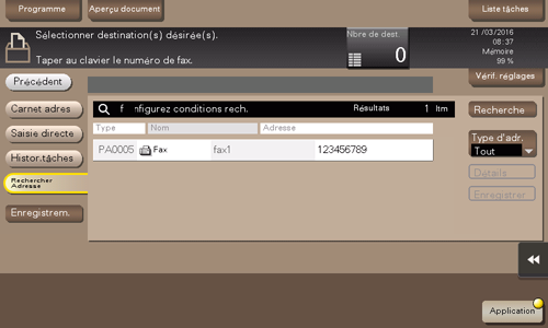 Procédure d'affichage : [Boîte utilisateur][Système][Ré-émission fichier]Sélectionner le fichier[Emission Fax][Rechercher Adresse]