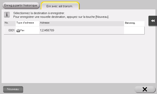 Enregistrez une nouvelle adresse dans le carnet d'adresses. Pour des détails sur la procédure d'enregistrement, voir [Enregistrer depuis l'écran de base Fax/Numérisation ] .