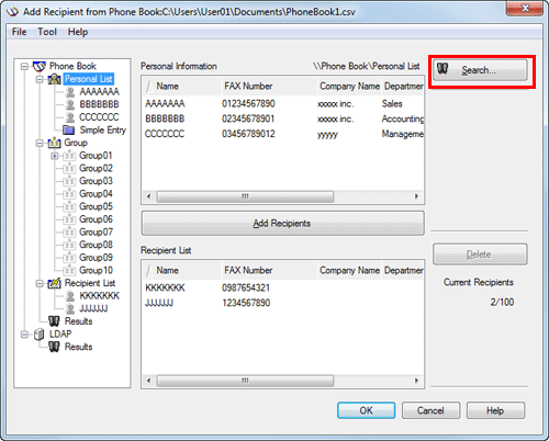 Um einen Empfänger aus dem Telefonbuch zu löschen, wählen Sie den Empfänger aus [Persönliche Liste] aus und klicken Sie dann auf [Löschen]. Der Empfänger wird aus der registrierten Gruppe gelöscht.