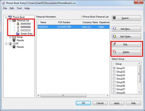 Die Teilnehmerinformationen werden registriert und unter [\\Telefonbuch\Persönliche Liste] angezeigt. Wenn Sie Gruppen für den Empfänger ausgewählt haben, wird dies in der Gruppenliste angezeigt.