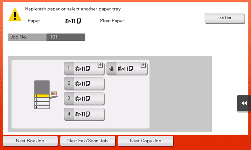 Wenn während eines Druckvorgangs das Papier ausgeht, werden Sie in einer Meldung aufgefordert, Papier aufzufüllen. Prüfen Sie das Papierformat und den Papiertyp und legen Sie Papier in das Fach ein oder wählen Sie ein anderes Fach aus.