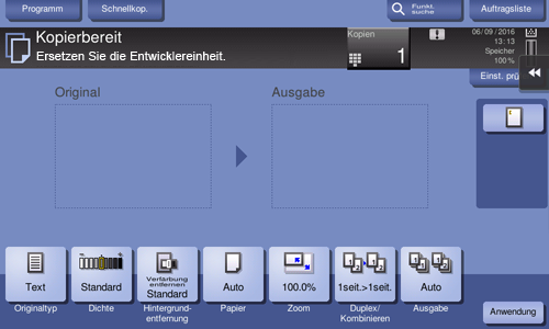Es müssen Einstellungen vom Servicetechniker vorgenommen werden, um die Meldung im Hinblick auf die Entwicklereinheit anzuzeigen. Weitere Informationen erhalten Sie von Ihrem Kundendienst.