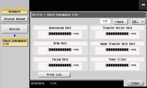Die Benutzer können auch [Bedienerprogramm] - [Einheiten überprüfen] wählen, um den aktuellen Status der Verbrauchsartikel (Füllstand) am Bildschirm anzuzeigen und zu überprüfen.