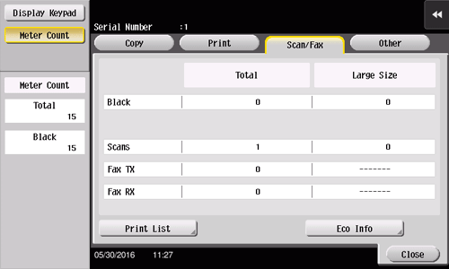 Prüfen Sie die Anzahl aller gescannten Vorlagenseiten im Modus Scannen/Fax oder Benutzerbox sowie die Anzahl aller Seiten, auf denen eine Datei in einer Benutzerbox oder eine empfangene Datei gedruckt wurde. Prüfen Sie ferner die Anzahl aller im Fax-Modus gesendeten und empfangenen Seiten.