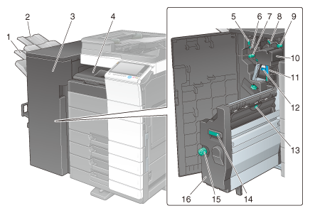 16 | Broschürenfinisher | Ziehen Sie diese Einheit zum Beheben eines Papierstaus oder Heftklammerstaus oder zum Austauschen eines Heftklammermagazins heraus. |