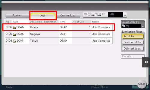 Sie können die Anzeige der Protokolle mit [Auftr. auswäh.] oder [Filtern einschränken].
