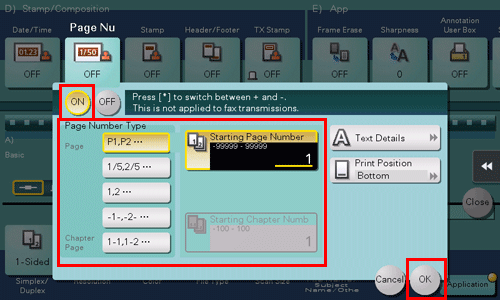 Tippen Sie auf [EIN], legen Sie Werte für [Stempeltyp] und [Seiten] fest und tippen Sie dann auf [OK].
