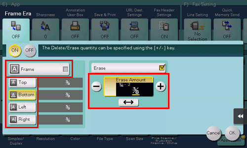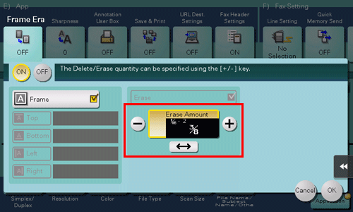 Um die vier Seiten des Originals in derselben Breite zu löschen, tippen Sie auf [+] und [-], um die Löschbreite anzugeben.