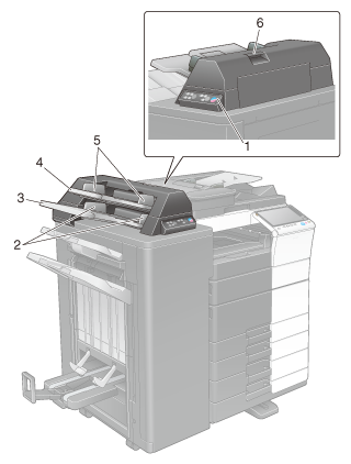 1 | Panneau de contrôle de l'unité d'insertion feuilles | Utilisez ce panneau en cas d'utilisation manuelle de l'unité de finition. Pour des détails sur la procédure d'insertion feuilles, voir Ici. |