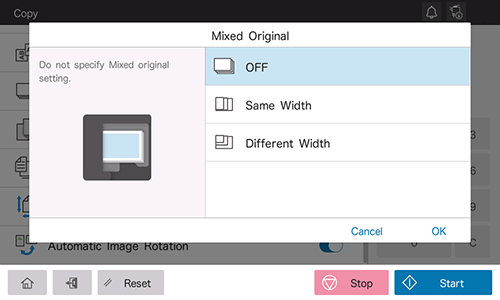 Even for an original with pages of different sizes, by using the ADF, you can scan data while detecting the size of each page. If the widths of the originals are the same, select [Same Width]. If the widths of the originals are different, select [Different Width].
