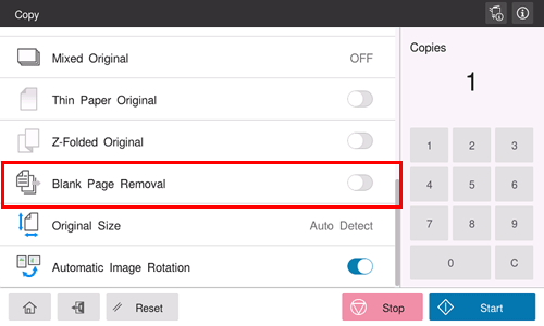 When [Blank Page Removal] is specified to scan an original including blank pages using the ADF, blank pages are excluded from scan targets. Blank pages detected are not counted as original pages.