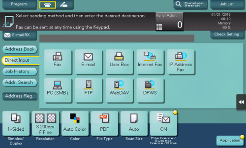 Dans [Saisie directe], tapez sur la touche correspondante du type de destination auquel vous souhaitez enregistrer ou envoyer, puis saisissez les informations de destination.