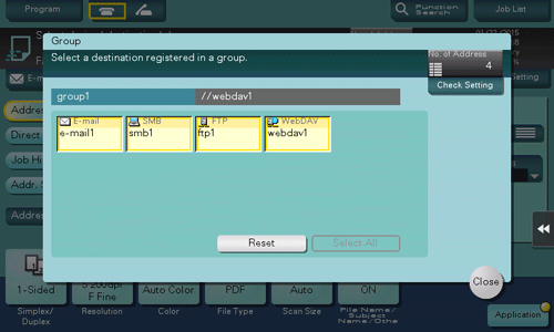 Lorsqu'un groupe est sélectionné dans [Carnet adres], sélectionnez la destination à laquelle vous souhaitez envoyer des données parmi les destinations enregistrées dans le groupe. S'il y a dans les destinations enregistrées dans le groupe une destination qui n'est pas souhaitée pour l'envoi des données, tapez [Tout sélection], puis tapez sur la destination pour la désélectionner.