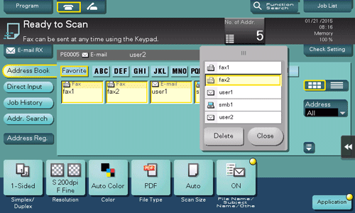 Dans [Histor. tâches], sélectionnez une destination dans l'historique des destinations d'émissions de données numérisées ou de destinations enregistrées.
