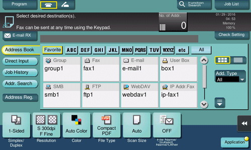 Il est possible d'envoyer des données par émission en diffusion, si vous sélectionnez plusieurs destinations. Vous pouvez également utiliser l'émission en diffusion en combinant différents modes d'envoi tels que Numériser vers e-mail et SMB Send.